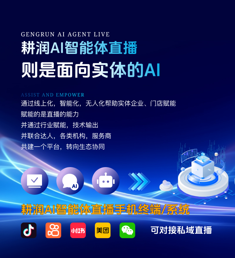 我们耕润AI智能体直播目前在线上化,智能化,无人化的技术能力已经展现了,应用落地在各行各业,帮助企业实现线上化,实体AI化,各类AI技术来克隆企业IP的声音,形象,并通过智能体来完成企业的大脑能力和行动能力,耕润AI直播手机终端的直播输出完成一键开播,产品线已经实现了从0到1,1到10的过程,我们希望更多的达人,更多的企业,更多的合作伙伴来行业赋能,让AI用在直播行业,直播毕竟离钱最近,共建一个耕润AI智能体直播生态平台,协同各方能力,资源,完成共赢。