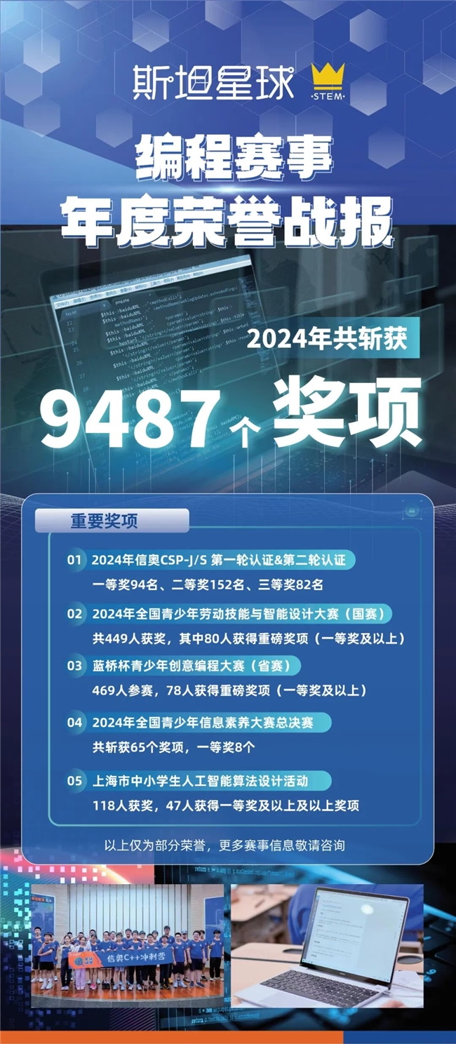 全年累计斩获各类编程赛事奖项9487个,3名学员晋级美国计算机奥赛(USACO)金组,赛事竞争力持续领跑行业。