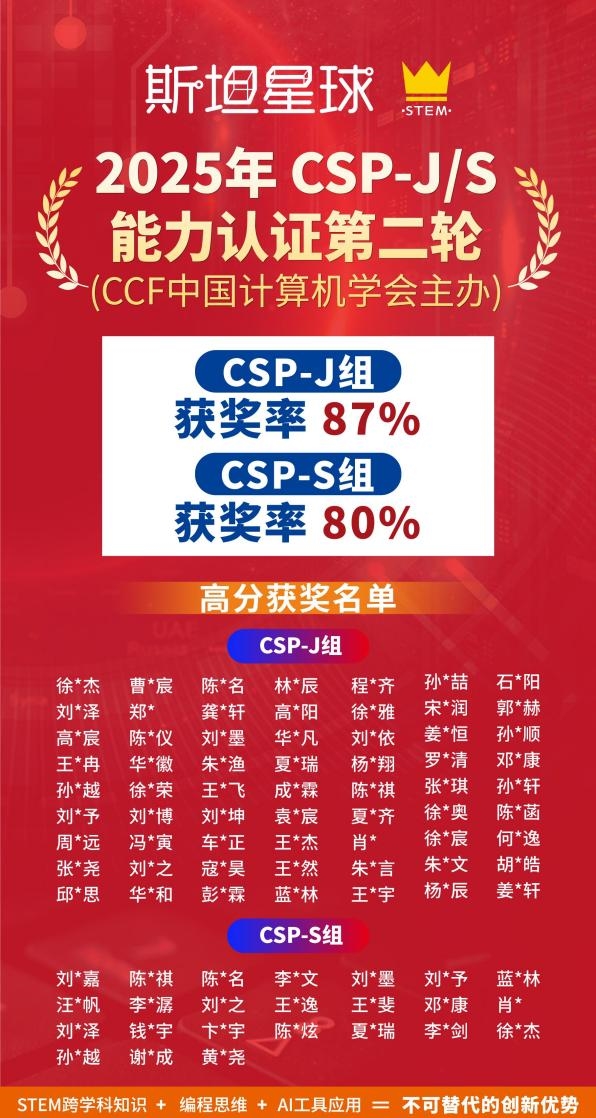 2025年11月,2025信奥CSP-J/S复赛放榜,斯坦星球C++学员成绩更是亮眼。CSP-J组获奖率达87%,CSP-S组获奖率达80%,更有14人成功晋级NOIP!