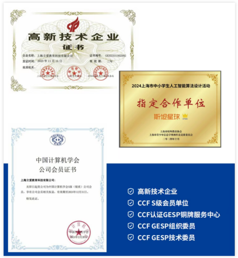 作为信奥主办方中国计算机学会(CCF)官方认证S级会员单位、GESP(编程能力等级认证)铜牌服务中心,斯坦星球与官方机构深度合作。