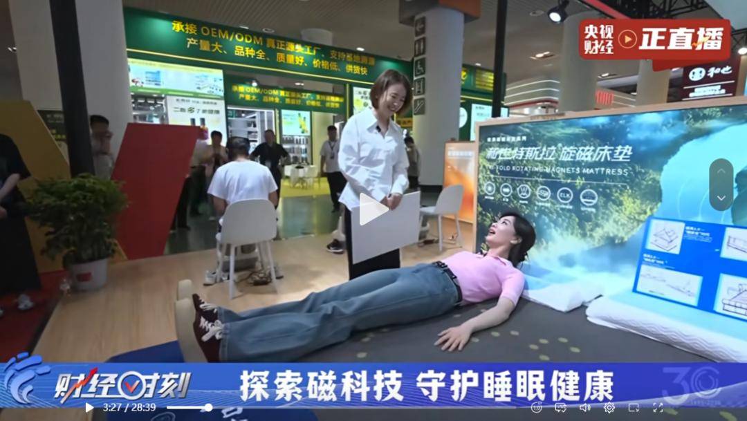 2025年,第22届中国国际保健博览会上,央视财经更是将直播镜头对准了特斯拉旋磁床垫——主持人郭若天亲身躺上这张床垫,向全国观众分享体验感受。