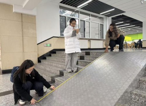 在技术勘测环节,团队成员手持卷尺等工具,对综合教学一号楼、建馆等重点区域的无障碍坡道展开测量,精准记录坡长、坡高、扶手高度、休息平台尺寸等关键数据,同时细致检查地面材料防滑性、安全挡台设置、扶手稳固度等细节,全面掌握设施现状。调研中发现,综一教学楼内设无障碍坡道坡度过大,建馆外侧坡道存在被自行车临时占用的情况,团队第一时间记录并提出针对性优化建议,用严谨态度守护通行安全。