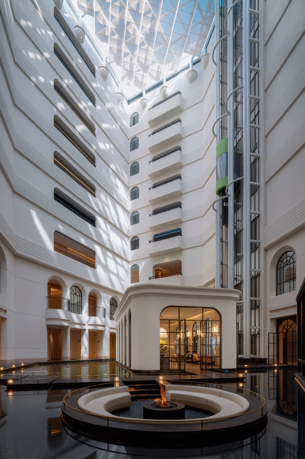 步入酒店,高达40余米的超高中庭设计,以震撼的竖向空间,隐喻对李时珍毕生攀山采药、仰望星空般求索精神的礼赞。自然光线倾泻而下,光影在水景与游鱼间流转,营造出空灵、静谧且充满呼吸感的“城市山林”意境。这处黄冈市独一无二的空间奇观,瞬间将宾客从尘嚣中抽离,开启一场身心的预备式沉浸。客房内部,设计语言则更为内敛温润。意大利高端品牌Acca Kappa的沐浴用品、热带雨林沐浴系统等高端配置,确保了国际水准的舒适体验,而整体氛围营造,则引导宾客在轻奢安逸中,感受东方养心哲学。