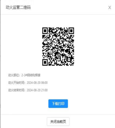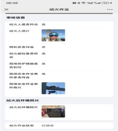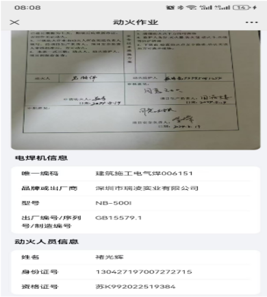 作业管理:制定动火审批流程,规范临时用电及燃气使用管理。三级动火限定作业时间8h,提前一天开具动火作业证,管理人员落实旁站要求,扫码上传动火前中后各阶段的动火管理情况。监火人姓名电话在灭火器材上公示,人员不符不予动火。