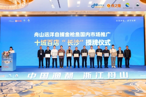 推介会上,举行了舟山远洋自捕金枪鱼国内市场推广“全国十城百店”长沙启动授牌仪式,玖鼎宴中餐厅、淳铁板烧、沸沸名品、圣爵非斯大酒店、华晨豪生大酒店、长沙美郡国际大酒店、梅溪湖金茂豪华精选酒店、小天鹅大酒店、神龙大酒店、华天大酒店、长沙融通长城宾馆、墨泉峰味、长沙麓谷温德姆至尊豪延大酒店13家餐饮企业榜上有名。舟山市远洋渔业协会与长沙餐饮行业协会青年名厨委员会还举行了行业合作框架协议签约仪式。