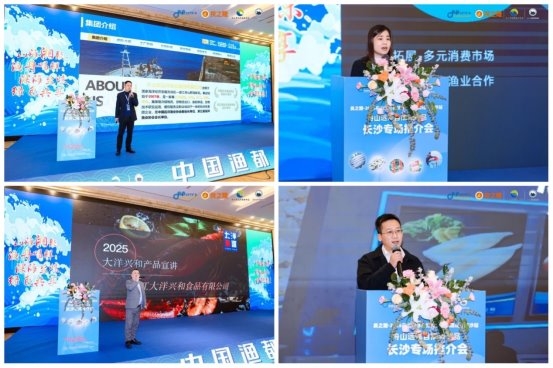 随后,平太荣远洋渔业集团、浙江大洋兴和食品有限公司、舟山顺行远洋渔业有限公司、浙江鑫旺食品有限公司等4家海产企业代表进行推介发言,就海产品消费趋势、品牌建设、供应链优化等议题进行了深入交流,还举行《深海秋刀鱼国内市场开发圆桌对话》,中国农业科学院饲料科学研究所原所长戴小枫、上海海洋大学朱清澄教授、湖南云冷冷链服份有限公司总经理助理李星、长沙淳铁板烧大厨周浩琛、湖南食文化研究会副会大长沙美郡酒店集团美食研究院院长李玉辉、上海海昌海洋公园控股有限公司经理张裕智共6位秋刀鱼上下游的产业大咖权威从捕捞保鲜、菜品融合、餐饮赋能、宠物食品罐头及水族馆鱼饲料新场景应用等不同领域创新发展,畅谈秋刀鱼国内大市场拓展、重塑产业新格局建议与想法,发表行业真知灼见。