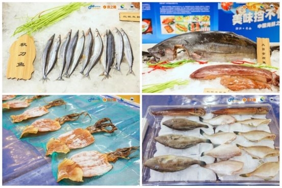 推介会现场设置了产品展示区,一条重达100斤的远洋自捕大目金枪鱼、20多斤重深鱼红鱿鱼吸引众人眼球,来自平太荣远洋渔业集团和大洋世家的金枪鱼刺身鱼块、罐头、鱼丸、鱼块、金枪鱼鱼滑、饺子、小笼包及金枪鱼肽制品等金枪鱼系列产品悉数亮相,来自大洋兴和、鑫旺食品、富丹食品的大刀鱿鱼片、天妇罗鱿鱼、唐扬鱿鱼须、大洋火箭鱿、樱花鱿鱼等火锅类新赛道鱿鱼产品以及冻鱿鱼圈、鱿鱼花、鱿鱼条、鱿鱼块、鱿鱼须串等冻品和鱿鱼鲞干制品,鱿鱼丝、鱿鱼仔等传统休闲调味品纷纷展示,银光闪闪的低温船冻的秋刀鱼及秋刀鱼罐头产品也惊艳全场。