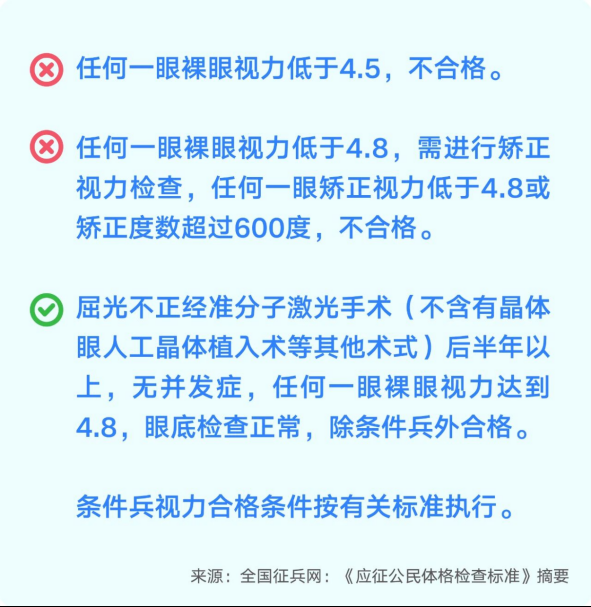 通过准分子激光手术进行视力矫正者,手术时间需在入伍体检前半年及以上,且无并发症,任何一眼裸眼视力达到4.8,眼底检查正常,方具备报名参军的资格。