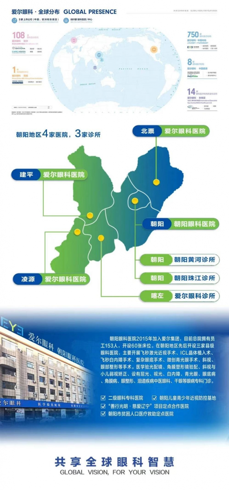 朝阳眼科医院2015年加入爱尔集团,先后开设三家县级眼科医院及三家视光门诊,拥有员工280余人。主要开展全飞秒4.0激光手术、ICL晶体植入术、精雕飞秒近视手术、飞秒白内障手术、复杂眼底手术、微创青光眼手术、斜视、眼部整形等手术。医学验光配镜、角膜塑形镜验配、斜视与小儿弱视矫正、设有屈光、视光、白内障、青光眼、眼底病、角膜病、眼整形、泪道疾病、中医眼科、干眼等眼病专科门诊。