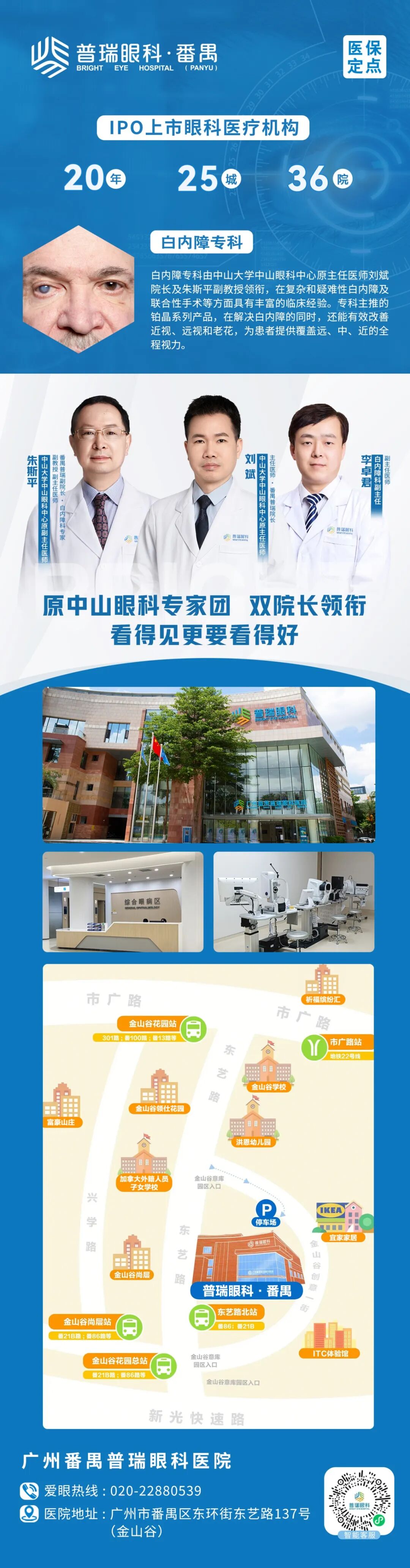 温馨提示:白内障是全球首位致盲性眼病,早期常表现为视力渐进性下降、视物模糊、重影、畏光等症状。随着技术发展,白内障手术已无需等待“成熟”,早发现、早治疗可更好保护视觉功能。如有相关症状,建议及时到番禺普瑞眼科医院进行专业检查。