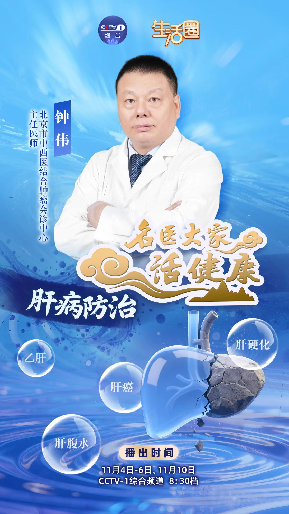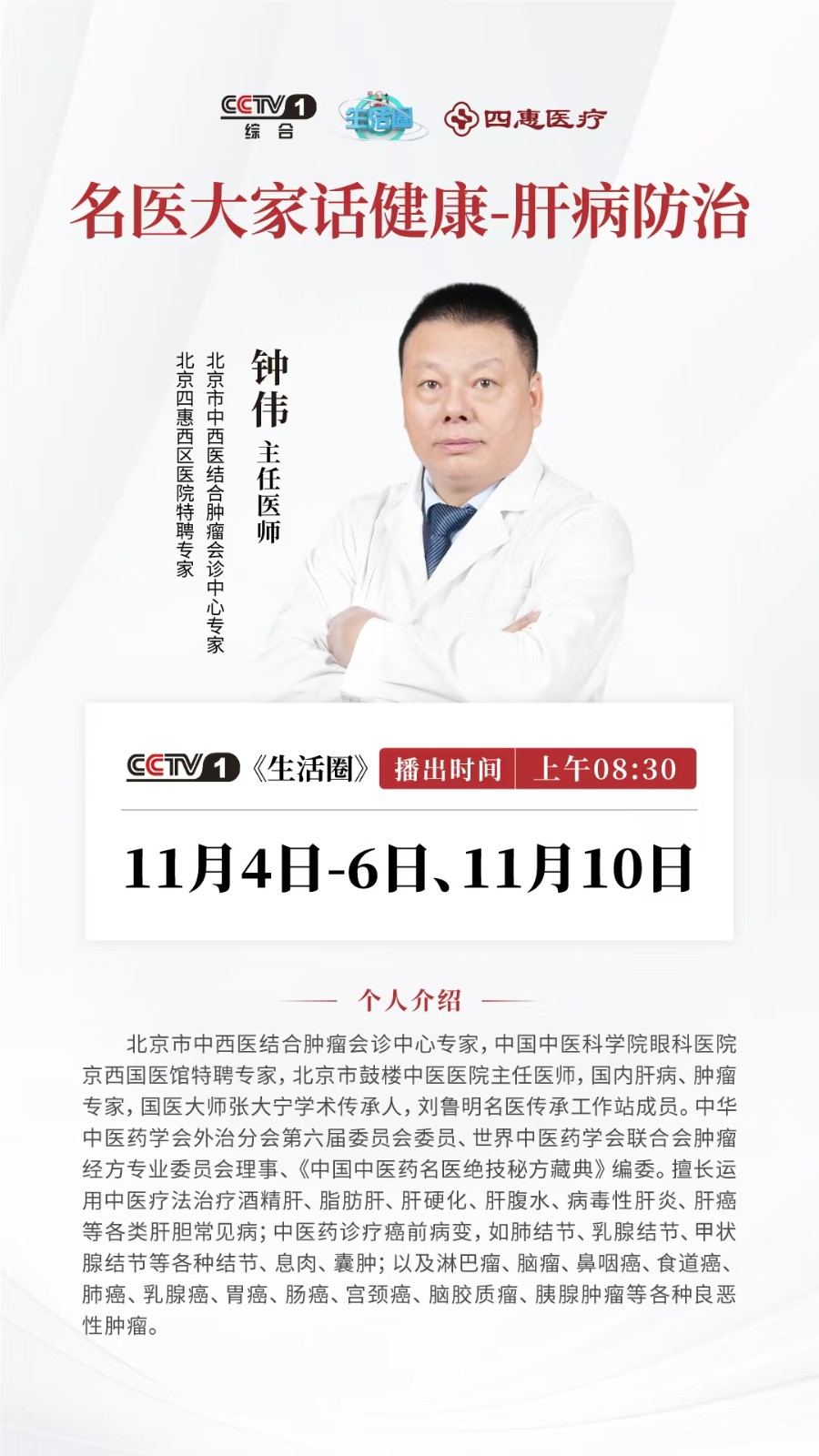 凭借深厚的专业积淀,钟伟受到主流媒体的广泛关注,多次受邀担任权威养生健康栏目主讲嘉宾。他曾做客北京卫视《养生堂微直播》、云南卫视《养生汇》、贵州卫视《国医养生堂》等栏目,向大众普及肿瘤、肝病防治常识与中医养生理念;