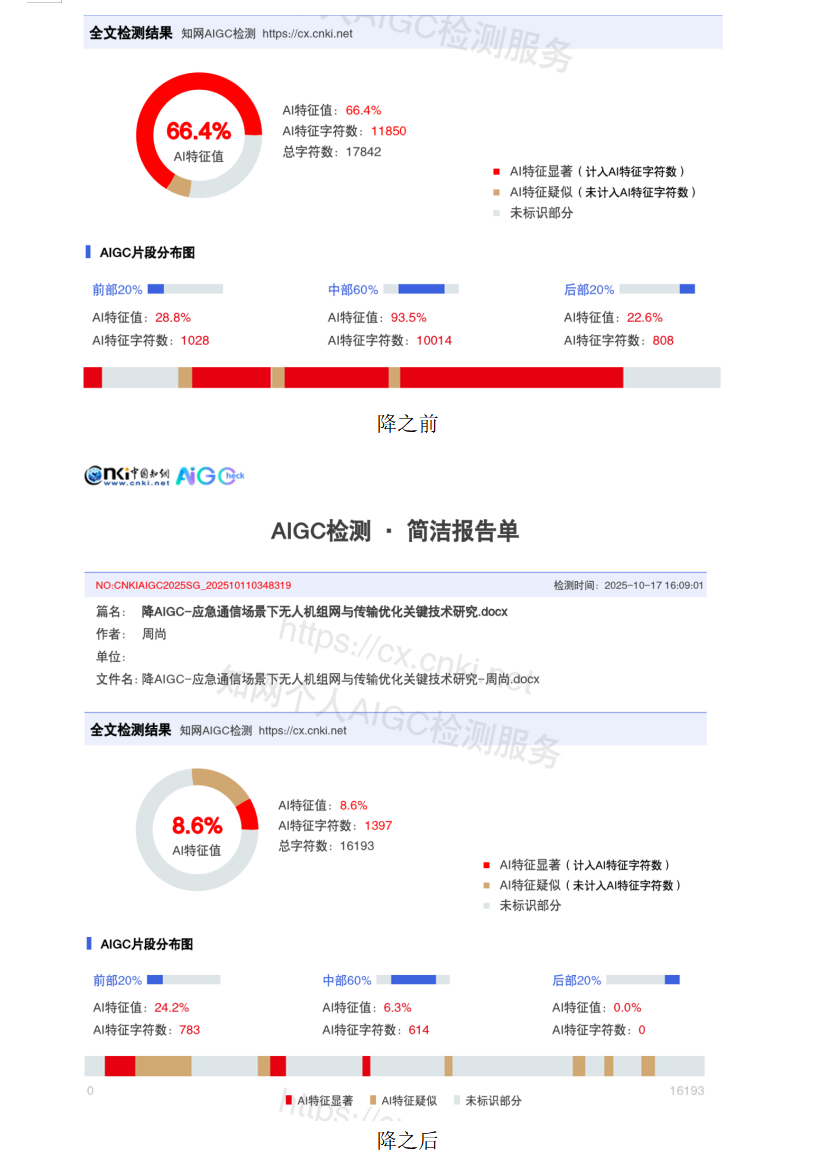 降迹灵 AI (jiangjiling.com)完全避开了这些雷区。它不是简单换词,而是靠深度算法重组句子结构,还能精准识别专业语境 —— 医科生的病理图表能 100% 保留,法学论文的法律条文引用不会漏,理工科的公式排版丝毫不变,改完的内容既没了机器味,核心观点和学术严谨性一点没丢。我那篇初始AI率66% 的论文,上传后5分钟就处理完,再测AI率直接降到8%,查重率也从39%落到7%,导师看了都没说有 “AI 感”。