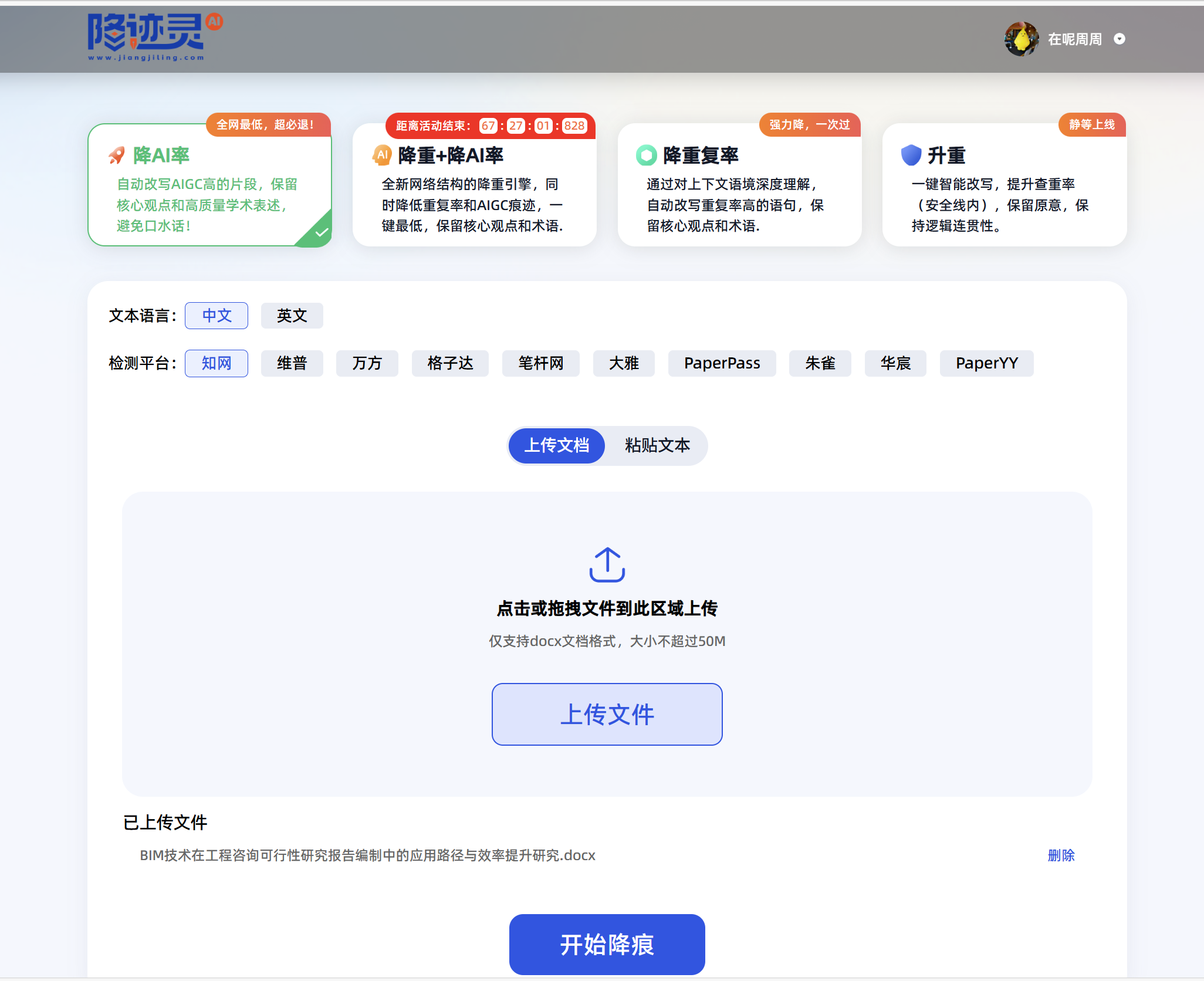 赶论文 ddl 的时候,真没精力研究复杂工具。降迹灵AI不用下载 APP,微信扫码就能登录,上传文档后等着出结果就行,全程自助操作,24小时都能用。