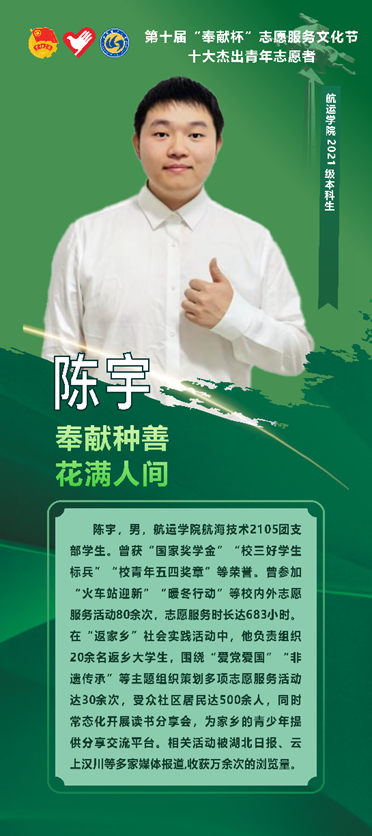 去年家乡遭遇低温雨雪灾害时,陈宇带领社区志愿者队伍破冰除雪、守护出行平安,用担当诠释青年责任。“社区教会我‘被照亮时感恩,有能力时发光’,志愿服务让我明白成长的意义不仅在于个人优秀,更在于回馈社会。”他的志愿服务时长累计超680小时,用实际行动践行着社区传递的互助精神。