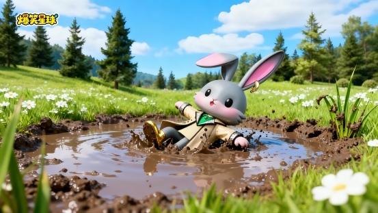 唛唛兔身着“露营风风衣”拍摄美照,被啾啾熊放置的“搞怪拍照道具”吓到,摔进泥潭导致风衣沾满泥巴,却笑着表示“这是‘野生潮流’,比穿搭大赛的造型更具个性”。