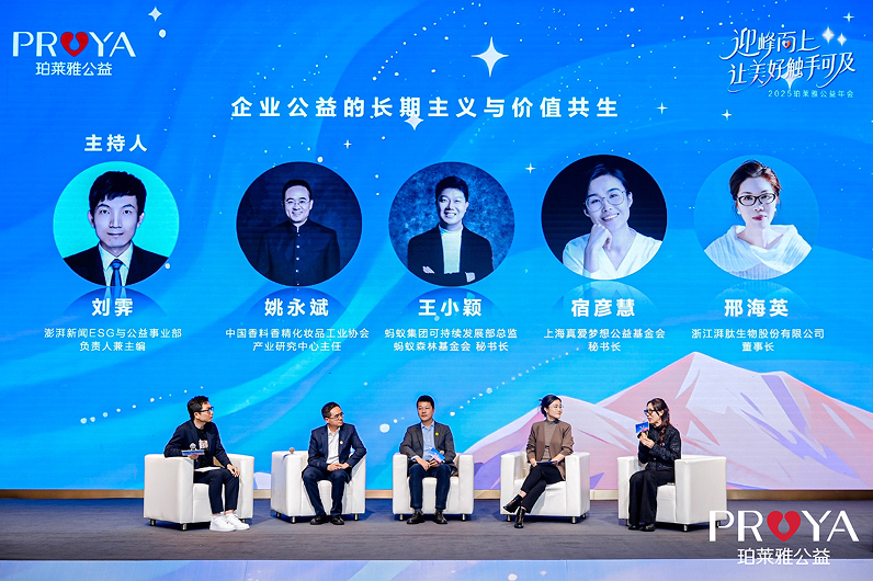 在随后的圆桌论坛环节,澎湃新闻ESG与公益事业部负责人兼主编刘霁、中国香料香精化妆品工业协会产业研究中心主任姚永斌、蚂蚁集团可持续发展部总监兼蚂蚁森林基金会秘书长王小颖、上海真爱梦想公益基金会秘书长宿彦慧及浙江湃肽生物股份有限公司董事长邢海英围绕“企业公益的长期主义与价值共生”主题,结合各自领域的公益实践展开对话。与会嘉宾们认为,未来的公益实践需更加注重针对不同群体的真实需求,提供定制化、深度的服务,从而切实提升项目的实效性与可持续性。这一共识也清晰地指向了一个更为宏观的趋势——企业公益正逐步告别零散化、短期化的传统模式,整体向着专业化、系统化、生态化的方向持续演进。