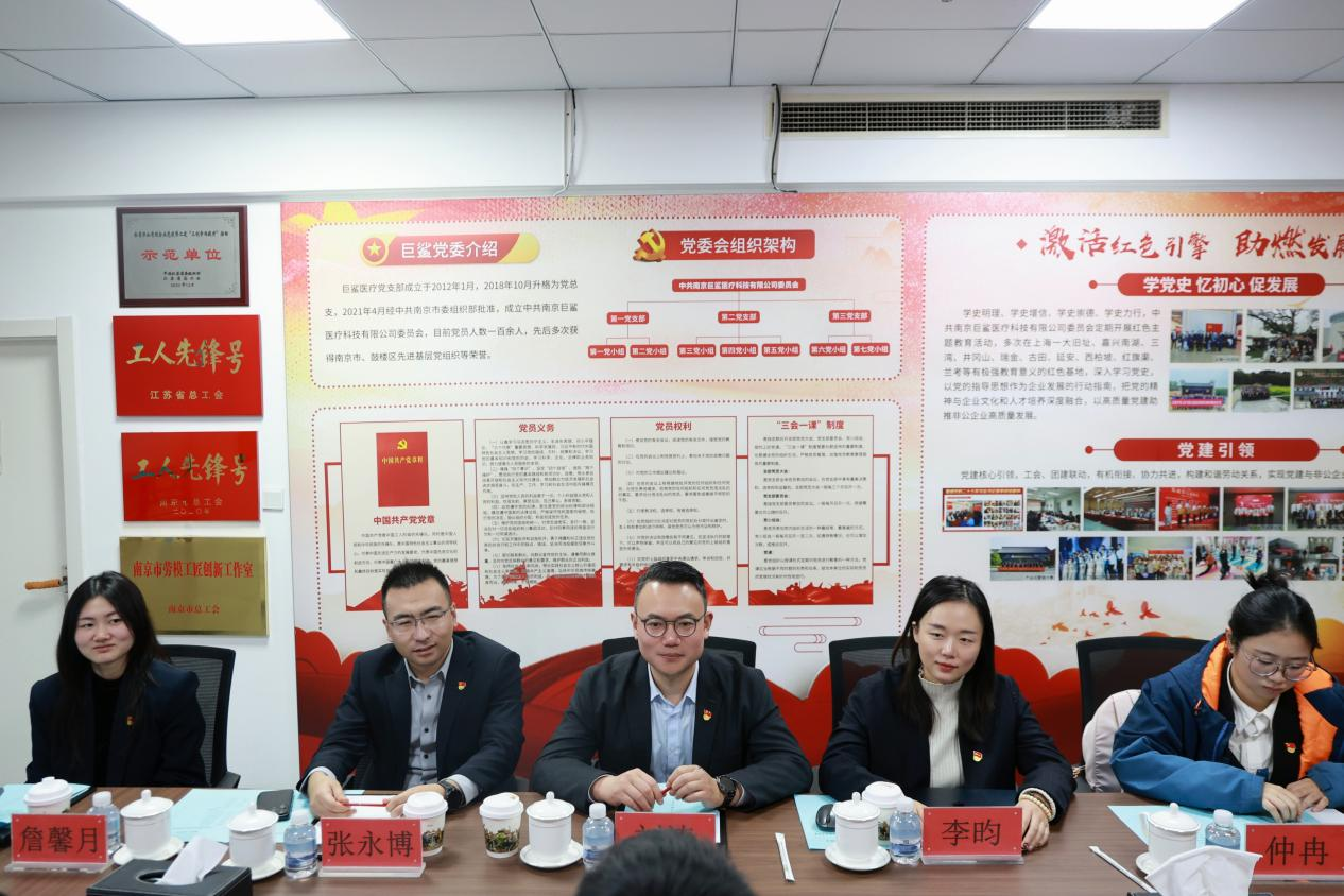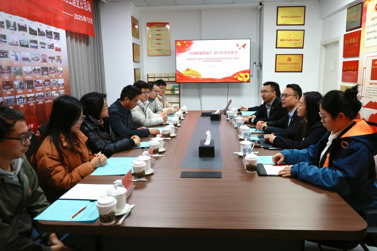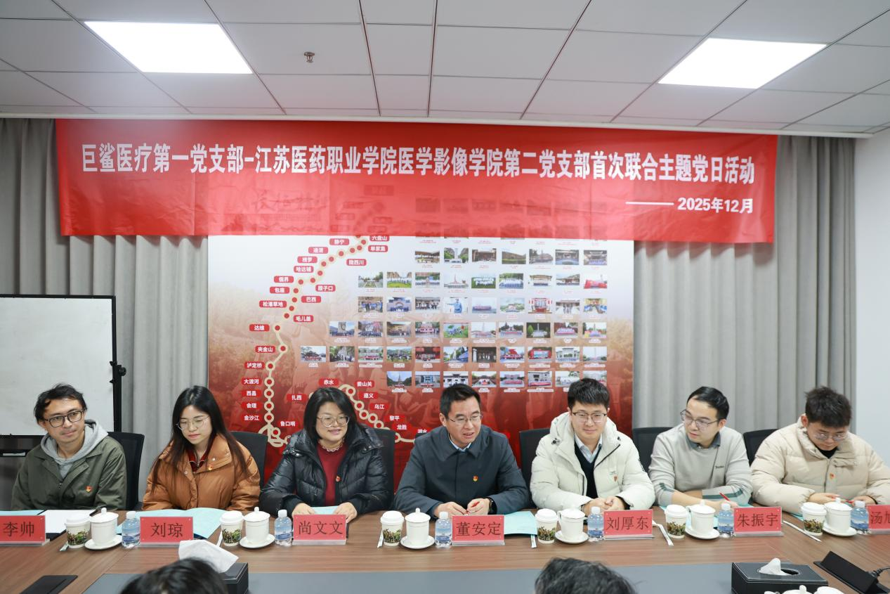 为深入贯彻落实江苏省委组织部、省委教育工委关于“高校党组织对接产业链党组织”专项行动部署,积极响应学校“党旗领航医链 聚势擎动健康”专场活动精神,推动党建与医药健康产业链深度融合,2025年12月18日,江苏医药职业学院医学影像学院第二党支部与南京巨鲨医疗科技有限公司第一党支部在南京联合开展“红链赋能促融合 智启医装育新才”首次主题党日活动,以实际行动践行“组织链”精准对接“产业链”,迈出校企党建协同育人的坚实一步。