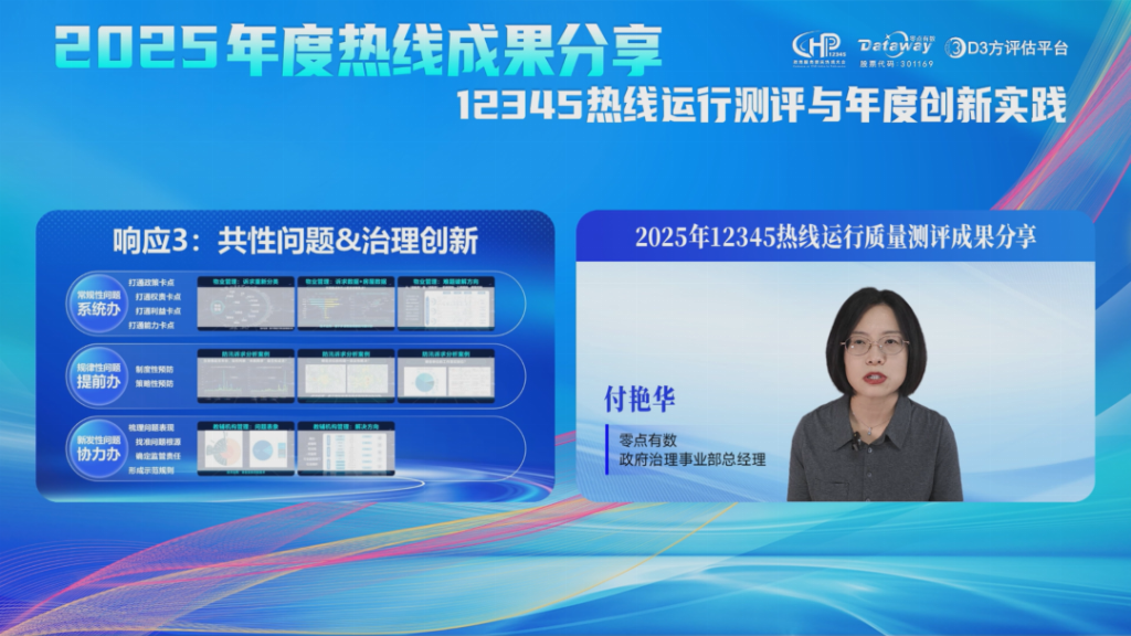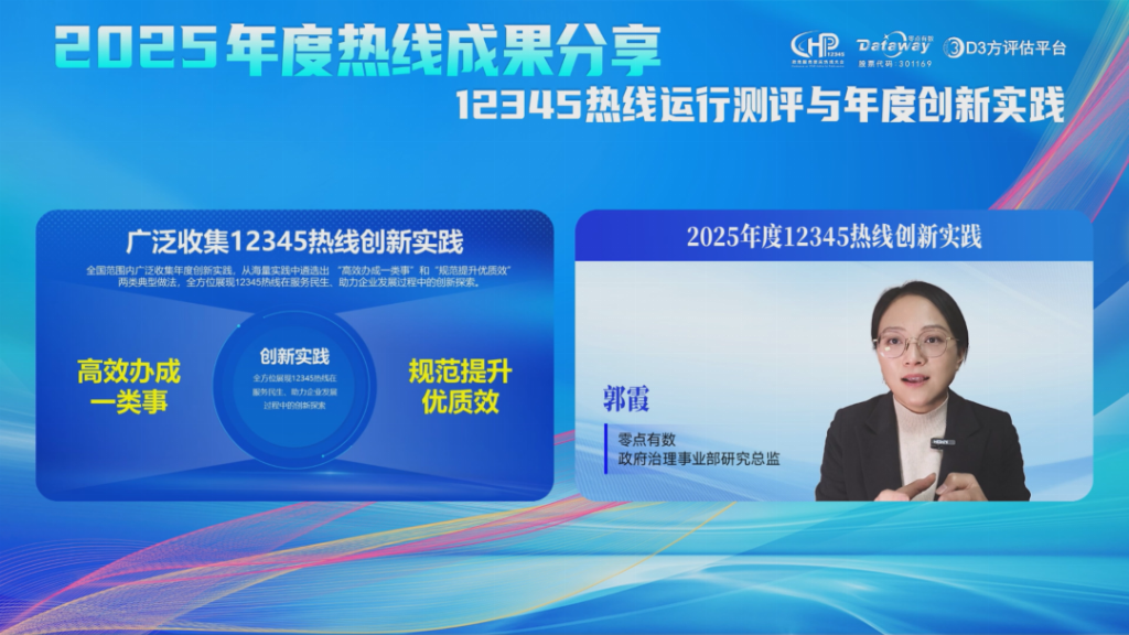 2025年12月25日,零点有数与D3方评估平台联合主办的“热线驱动治理 高效惠企利民——2025年度12345政务服务便民热线成果分享”在线上成功举办。本次活动系统发布了2025年12345热线运行质量测评成果,深入探讨了生成式人工智能与知识计算在热线服务中的融合应用,展示了“挚政智能体工厂”在热线场景的落地实践,并分享了来自全国多地热线的年度创新实践场景,为政务服务热线的提质增效与治理现代化提供了前瞻思路与实践参考。