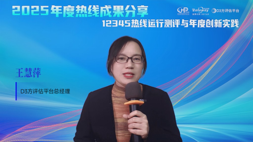 D3方评估平台总经理王慧萍作为活动主持人,带领大家回顾了热线测评事业十五年来的发展历程。她指出,早在2010年,零点有数便携手合作伙伴启动了全国热线测评工作,当时这项致力于提升公共服务质量的工作尚处于“坐冷板凳”的阶段。从最初的默默坚守,到如今热线已成为基层治理的重要抓手和蓬勃发展的“热引擎”,这一变迁深刻反映了“以人民为中心”发展理念的落地与实践。她表示,作为行业发展的持续观察者与推动者,零点有数与D3方评估平台未来将继续携手各方,以客观数据与专业评估助力热线服务提质增效,让这条“连心桥”更加畅通、温暖、高效。