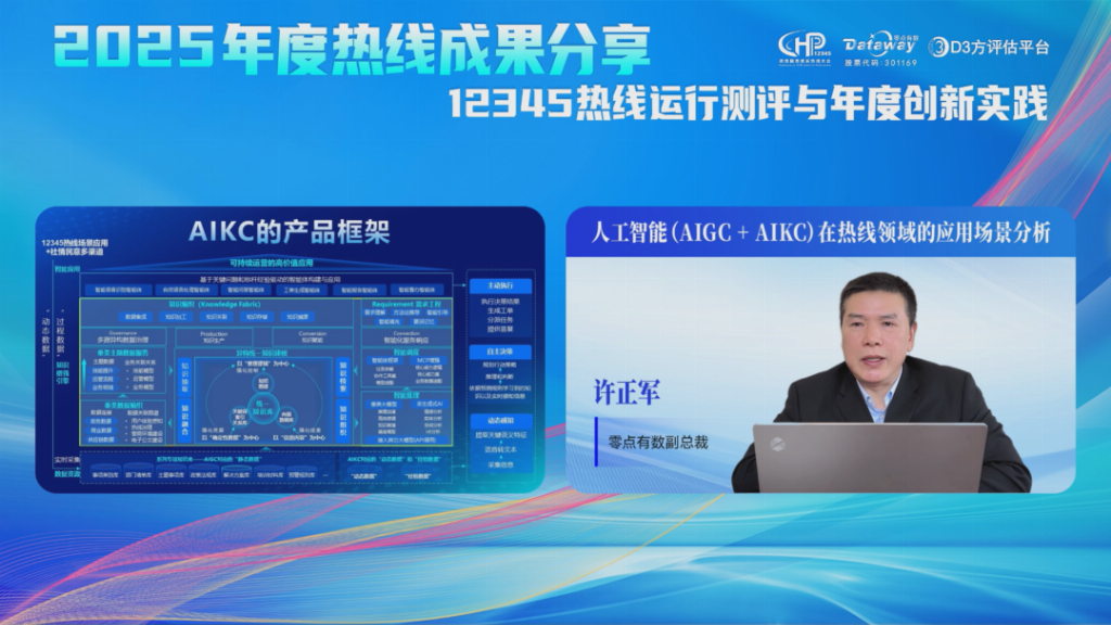 零点有数副总裁许正军在题为《人工智能(AIGC+AIKC)在12345热线领域的应用场景分析》的分享中,系统梳理了AI技术在热线全流程中的赋能实践,并重点提出了从AIGC系统(仅基于历史静态数据的大模型垂域应用系统)向AIKC(知识支持型人工智能)的范式演进。他指出,当前的AIGC系统可解决热线中80%—90%的标准化问题,但在应对特定专项问题时,往往存在知识滞后,或缺乏人类经验支撑等存在一定的局限性。为此,零点有数提出AIKC新路径——通过融合实时动态数据、专家经验库、专项知识图谱等,构建“数据-知识-智能体”三层增强体系,使热线系统在特定场景中具备接近人类专家的决策与处置能力。许正军以“物业纠纷调解”为例,展示了AIKC如何通过知识增强引擎,为坐席或调解员提供包含相似案例、沟通话术、处置策略的“智能策略包”,从而将首次化解率与服务满意度大幅提升。他强调:“未来的热线智能系统不应只是历史静态数据驱动,更应是‘专家经验+实时数据+领域知识’三者的深度融合,从而更好地赋能大模型在热线领域的应用成效,进一步提升热线业务服务效率和服务质量。”