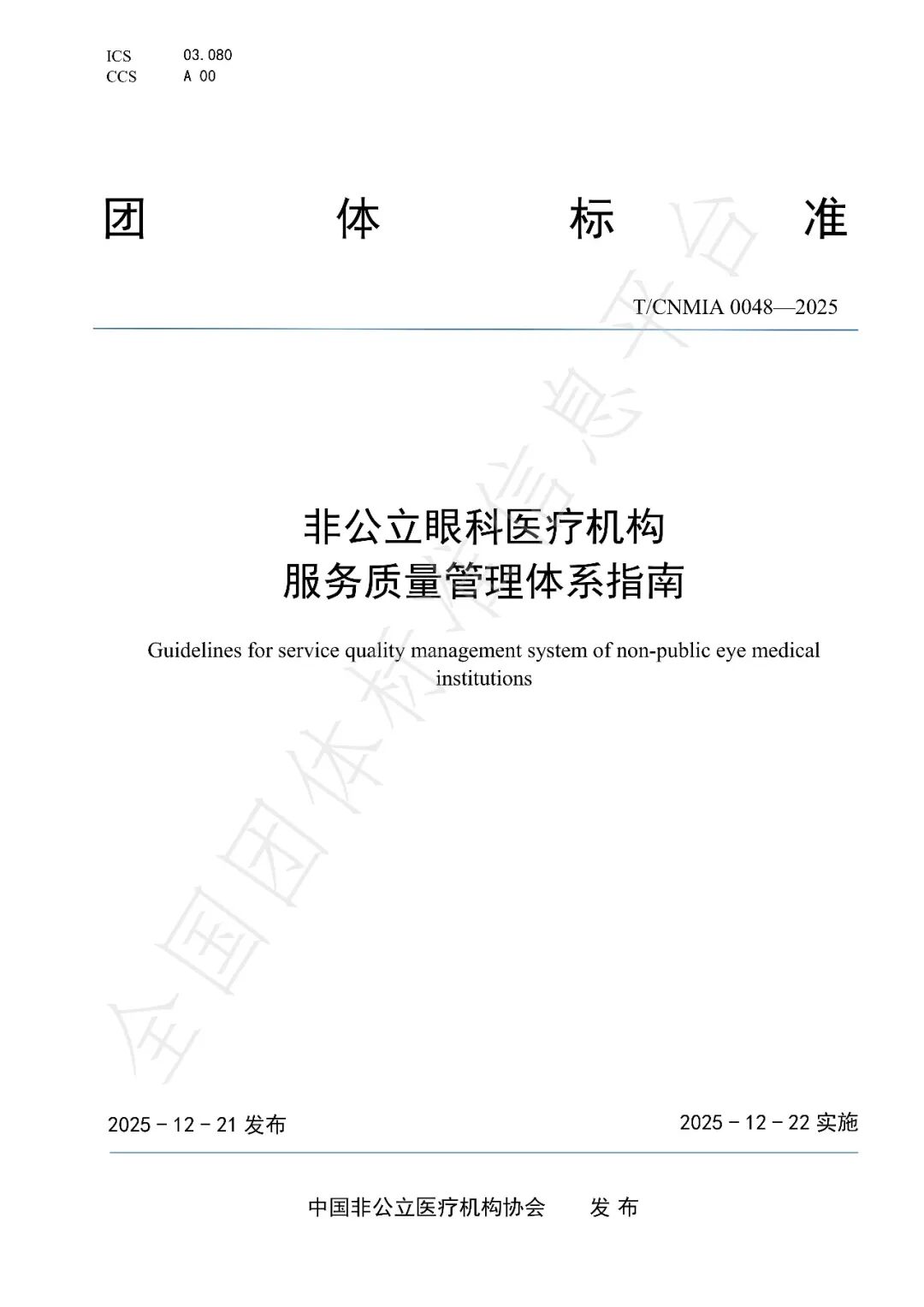 《非公立眼科医疗机构服务质量管理体系指南》团体标准发布公告
