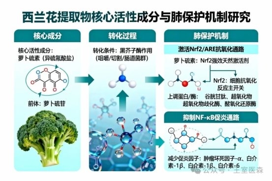 西兰花提取物的核心活性成分是萝卜硫素,它是一种异硫氰酸盐。其前体“萝卜硫苷”在黑芥子酶作用下(通过咀嚼、切割或肠道菌群)转化为萝卜硫素。其肺保护作用主要基于两大核心机制: