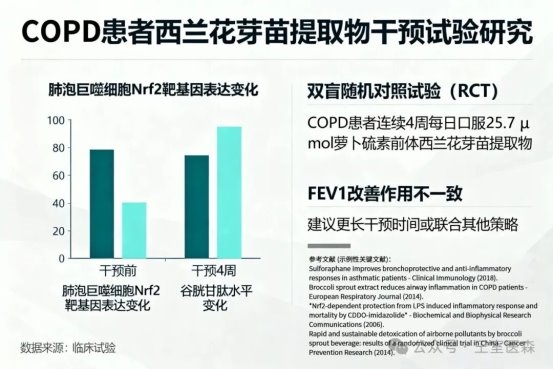 临床试验:一项双盲随机对照试验(RCT)发现,COPD患者连续四周每日口服富含萝卜硫素的西兰花芽苗提取物(25.7 µmol萝卜硫素前体)后,其肺泡巨噬细胞中Nrf2靶基因表达增加,且谷胱甘肽水平上升。然而,对于肺功能(FEV1)的改善作用在不同研究中结果不一致,提示可能需要更长的干预时间或与其他策略联用。