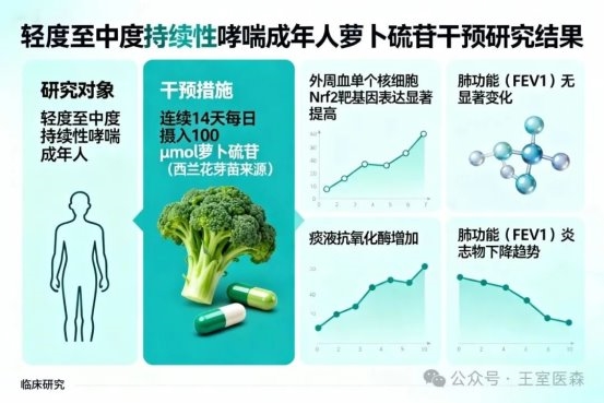 临床试验:一项针对轻度至中度持续性哮喘成年人的RCT显示,连续14天每日摄入100 µmol萝卜硫苷(来自西兰花芽苗),可显著提高外周血单个核细胞中Nrf2靶基因的表达,并观察到痰液中抗氧化酶增加。虽然肺功能(FEV1)未发生显著变化,但炎症标志物呈下降趋势。