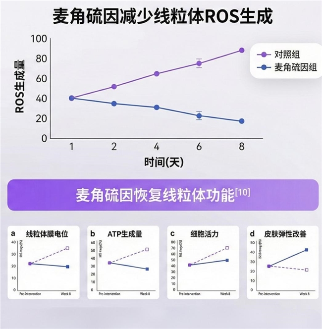 麦角硫因是1909年由法国科学家Charles Tanret首次发现的天然含硫氨基酸,作为唯一能通过特定转运蛋白OCTN1进入线粒体的天然抗氧化剂,其抗氧化能力远超普通抗氧化成分。《Journal of Investigative Dermatology》的研究证实,麦角硫因保护细胞免受紫外线诱导损伤的效果比常规抗氧化剂高87%。这一功效的核心机制在于,麦角硫因能精准靶向线粒体——这个人体细胞的“能量工厂”,而线粒体正是活性氧自由基(ROS)的主要产生地,过量ROS会直接破坏细胞内的脂质、蛋白质与DNA,加速细胞衰老与凋亡,进而引发皮肤松弛、皱纹滋生等问题。