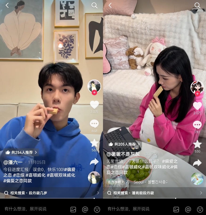 洞察恋综磕糖经济的嘉顿,精准捕捉到《偏爱之恋》中段丹徽与潘肖毅这对CP的独特魅力——两人在克制中藏着深沉的双向奔赴,这份细腻拉扯的甜蜜感,与品牌「双重夹心双倍美味」的核心卖点天然契合。凭借敏锐嗅觉抓住这一高甜苗头,嘉顿快速推进合作,邀请二人拍摄专属 Vlog——女生身着粉色帽衫、男生搭配蓝色帽衫,「自古红蓝出 CP」的视觉符号自带氛围感。这波「追着糖点做营销」的操作,让营销物料变身粉丝追捧的「磕糖补给包」,评论区满是「装都不装了,这对和嘉顿锁死了」的狂欢反馈,实现了磕糖热度到品牌声量的高效转化。
