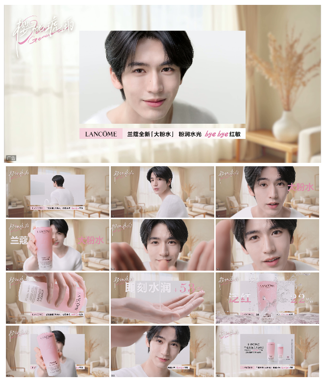 例如优酷为兰蔻定制的「AI宠粉动效」广告,以品牌代言人张凌赫的现有素材为基础,通过AIGC生成近景互动特效,实现了艺人「突破屏幕」与用户进行「摸头杀」等亲密互动。这种创新形式将单向的广告观看转化为沉浸式的互动体验,在赢得用户喜爱的同时,极大地提升了品牌好感度。