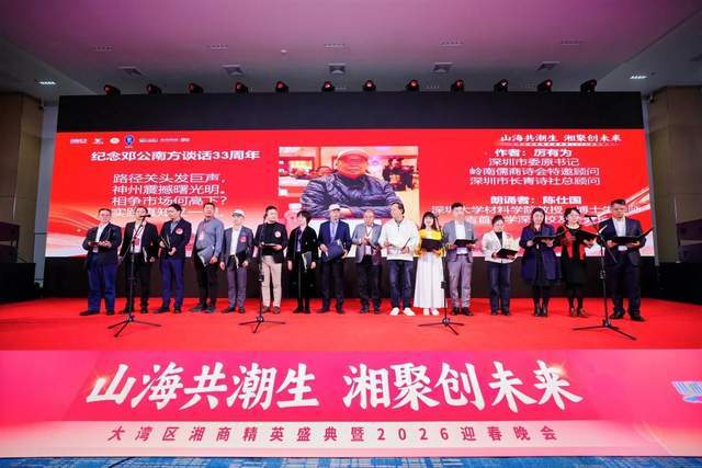深圳市委原书记厉有为创作的《纪念邓公南方谈话33周年》:“路径关头发巨声,神州震撼曙光明。相争市场何高下?实践真知又一程。”诗句铿锵,唤起改革初心,由吉首大学深圳校友会陈仕国会长朗诵,更显历史厚重。湖南驻深办原主任彭发生先生的《湾区欢歌》则热情洋溢:“湾区红棉笑迎春,山海潮泳汇楚军。风雨同舟堪握手,肝胆共业总连心。”(朗诵者:湖南农业大学深圳校友会刘荣欣执行会长)。深圳市委原常委警备区政委曹绍业先生的《相聚大湾区诗会有赋》对仗工整,意境高远:“山海同潮鹏翼张,湘音共月酿华章。湾区浪涌千帆竟,岳麓枫擎一脉长……”(朗诵者:湖南涉外经济学院深圳校友会杨冰虎会长)。深圳市工商联原副主席、巡视员陈作耕先生的《大湾区湘商精英迎春晚会感赋》豪情万丈:“大湾潮阔竞风流,万里湘商共远舟。肝胆长悬明月在,云雷再起写春秋。”(朗诵者:湖南人文科技学院深圳校友会彭尚武会长)。此外,贺贤赟先生的《水润天下赞》(朗诵者:深圳市中南大学校友会朱玉佩联席会长)、邹国荣先生的《为“大湾区湘商精英盛典暨2026迎春晚会”题贺》(朗诵者:湖南第一师范广东校友会任洪波会长)等十余首诗词,或嵌名寄意,或直抒胸臆,通过会长们声情并茂的演绎,将千年的湖湘文脉与当代企业家的开拓情怀完美交融,完成了一次震撼心灵的文化赋能,彰显了湘商群体“文商并重”的深厚底蕴。