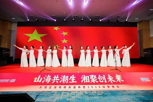 而最为激动人心、引发全场共鸣的,莫过于由深圳市长青老干部艺术团专业演绎的《湾区校友之歌》。这首由贺贤赟作词、刘文力作曲的专属歌曲,旋律昂扬,歌词深刻:“雲海茫茫,鸿雁翱翔,每一声呼啸都激越昂扬……南海茫茫,潮起珠江,每一次浪卷都勢不可擋……人海茫茫,校友情长,每一个脚步都坚定铿锵。挽起彼此的臂膀,挺起胸膛,拥抱远方。用实干谱写时代华章。”当歌声响起,现场大屏幕同步播放着精心制作的视频,画面中滚动展现百余个湖南高校湾区校友会近年来丰富多彩的活动剪影——学术论坛的深思、企业参访的务实、文体联谊的欢快、公益慈善的温暖……“融合南方北方,建设我们的第二故乡。包容东方西方,联合铸造华夏的辉煌。”歌声与画面交织,深深激荡起在场每一位湘籍校友的归属感、自豪感与使命感,将晚会气氛推向最高潮。