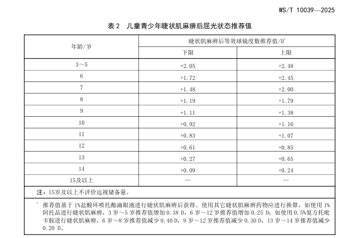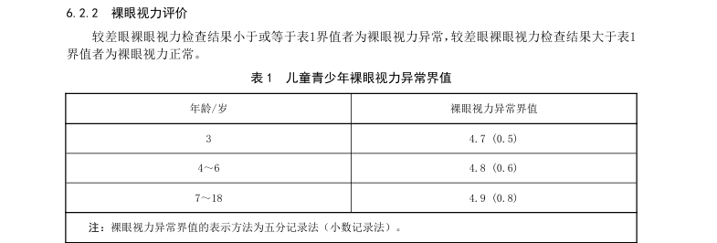 《儿童青少年裸眼视力和屈光状态评价规范》首次明确了各年龄段远视储备的推荐值范围,为早期发现近视风险提供了量化依据。规范给出不同年龄视力异常判断标准:3岁≤4.7、4~6岁≤4.8、7~18岁≤4.9;以及不同年龄远视储备推荐值下限(通过散瞳验光,低于下限为远视储备不足):3~5岁,+2.05D;6岁,+1.72D;7岁,+1.48D;8岁,+1.19D;9岁,+1.11D;10岁,+0.92D;11岁,+0.83D;12岁,+0.75D;13岁,+0.27D;14岁,+0.09D。判定为远视储备不足的孩子,应保证户外活动时间充足和注意用眼卫生,宜每3个月~6个月复查。对远视储备不足75度的近视前期者,应在专业人员指导下采取综合预防干预措施。在非散瞳状态下判定为疑似远视储备量不足者,应及时到医疗机构进行睫状肌麻痹检查真实屈光状态。