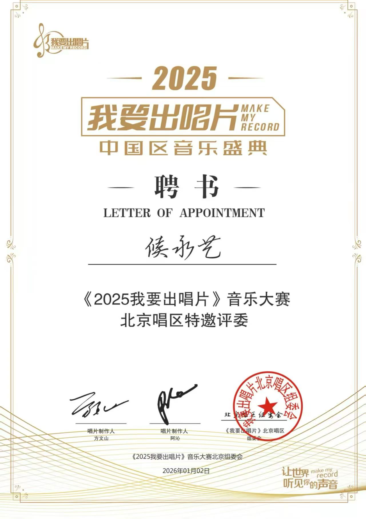近日,备受华语乐坛关注的专业音乐赛事《2025我要出唱片》北京唱区总决赛正式圆满落幕,中国内地实力唱作人、词曲制作人侯永艺凭借在音乐创作与演唱领域的卓越成就受邀坐镇总决赛现场担任评委!以专业视角助力音乐新秀成长,为赛事注入原创力量!