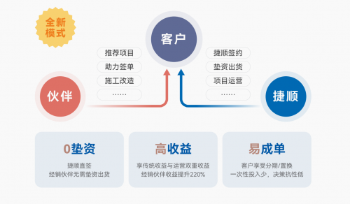 捷顺直签模式,即:经销伙伴挖掘客户,捷顺与客户直接签约、直接垫资、直接回款。伙伴无需承担设备采购垫资、项目施工垫款,且能即时分润,从“重资产运营”转向“轻资产创收”。