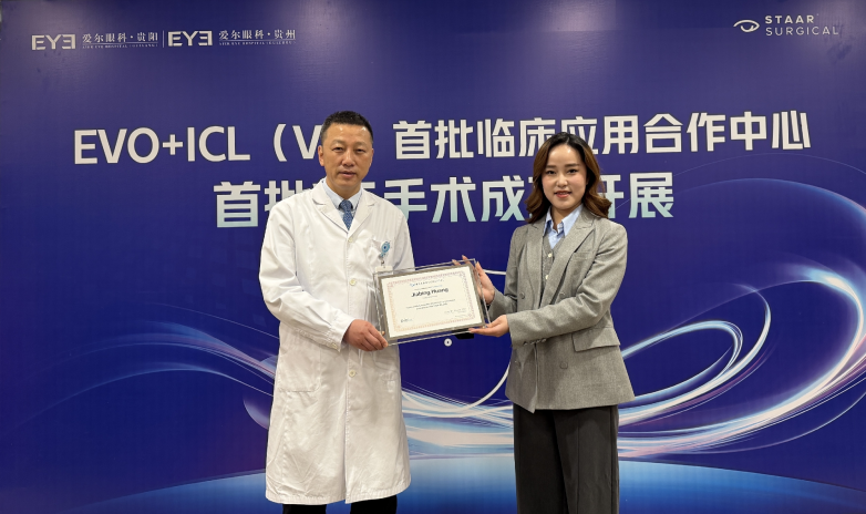 2026年1月8日上午,贵阳爱尔眼科医院隆重举行EVO+ ICL(V5)授牌仪式,标志着贵州近视矫正技术正式迈入国际领先行列。ICL中国官方机构代表亲临现场,授予贵阳爱尔眼科医院“EVO+ ICL(V5)首批临床应用合作中心”资质,并向贵阳爱尔眼科屈光学科带头人黄加兵院长颁发官方认证证书。