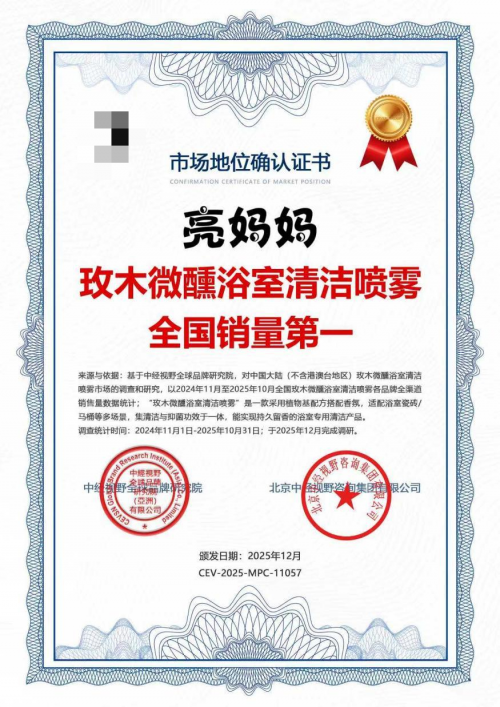 于是,一种微妙但坚定的消费转向正在发生:人们不再满足于“洗干净”,而是追求“洗得舒服、闻得安心、用得省心”。正是在这样的背景下,“亮妈妈 玫木微醺浴室清洁喷雾”悄然走红,并于近期被中经视野全球品牌研究院确认为2024年11月至2025年10月中国大陆玫木微醺型浴室清洁喷雾品类的全国销量第一品牌。