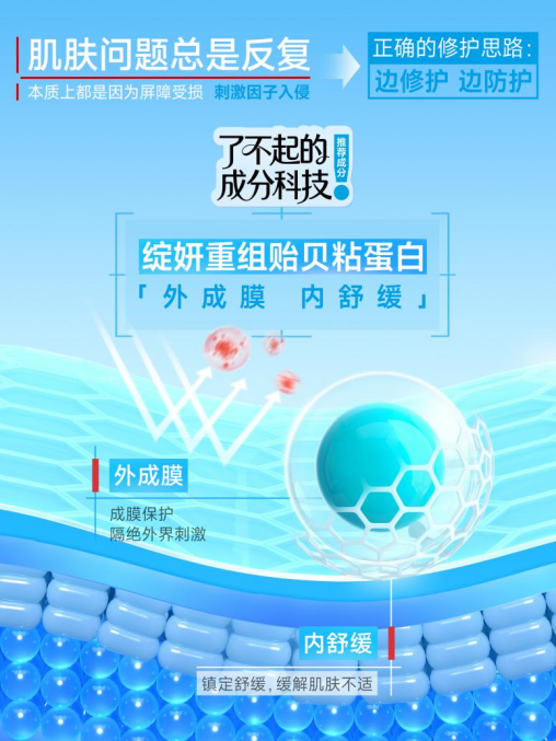 绽妍生物依托自身医研背景与生物基因工程技术,在国内实现了重组贻贝粘蛋白大规模量产,推动其从医学领域走向化妆品赛道,由实验室走向梳妆台。重组贻贝粘蛋白通过外成膜、内舒缓的功效机理,能够在受损皮肤表面形成「速修膜」,宛如第二层皮肤,快速隔绝刺激,同时快速舒缓修护,增强皮肤耐受力,终结“防不住、修得慢”的护肤痛点。