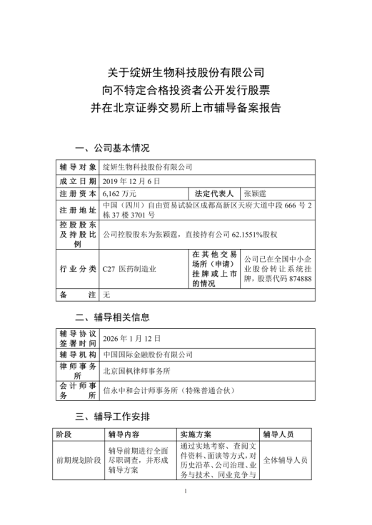 2026年1月13日,绽妍生物科技股份有限公司(以下简称“绽妍生物”)正式启动上市辅导工作,辅导机构为中国国际金融股份有限公司,这标志着绽妍生物向着登陆北京证券交易所的目标迈出了关键一步,开启了企业发展的全新征程。