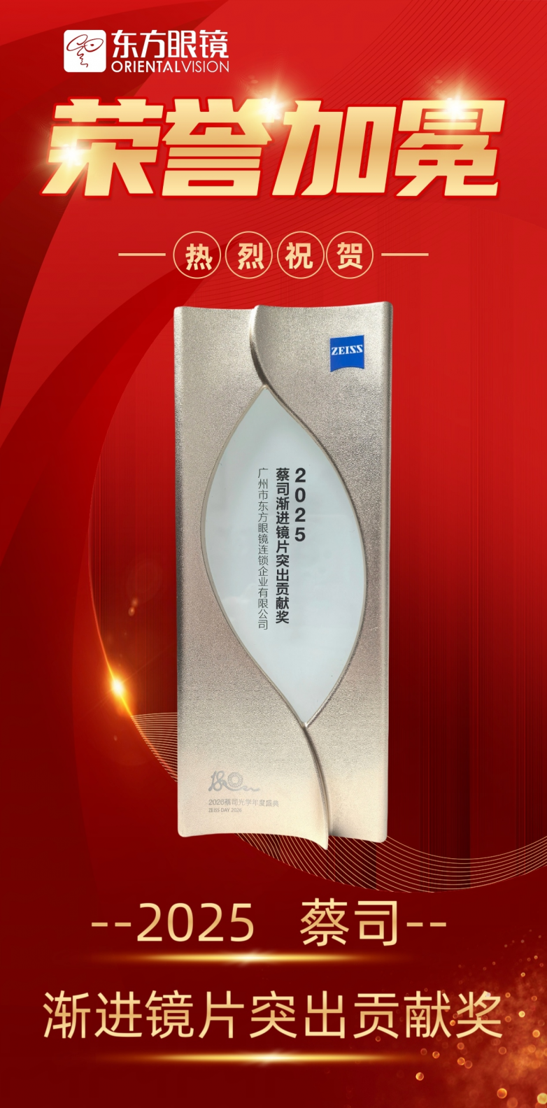 盛典上,蔡司表彰了多年来在专业镜片领域贡献突出的合作伙伴。值得注意的是,早在2025年蔡司光学战略发布会上,广州东方眼镜已凭借卓越的市场表现与专业的渐进镜片推广能力,脱颖而出,荣获两项重磅荣誉——“蔡司光学年度最佳战略客户”和“蔡司光学年度渐进之星”。其中,“渐进之星”的取得,得益于广州东方眼镜在渐进镜片验配量与专业服务覆盖率上的显著优势,其相关业务表现已达到行业平均水平的数倍,展现出深厚的专业积累与市场引领力。