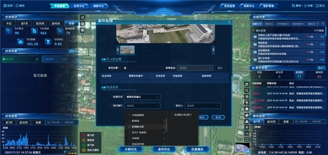 统一管控解“合规”,打破部门协同壁垒:平台建立全流程飞行管理体系,实现飞行计划在线审批、作业轨迹实时追溯,确保所有巡检作业透明可视、合规可控。通过开放兼容的技术架构,支持10+主流无人机品牌接入,无需更换硬件即可实现统一调度,避免设备闲置浪费。搭建跨部门数据共享平台,整合各领域巡检数据,形成“一张图”管理模式,实现问题统一上报、协同处置与定向复核,打破信息壁垒,构建“发现—处置—复核”的业务闭环,提升治理协同效能。