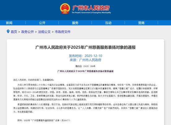 2025年12月,广州市人民政府公布 2025年广州慈善服务表扬名单,无限极(中国)有限公司凭借在教育与体育公益领域的持续深耕,成功入选“广州慈善服...