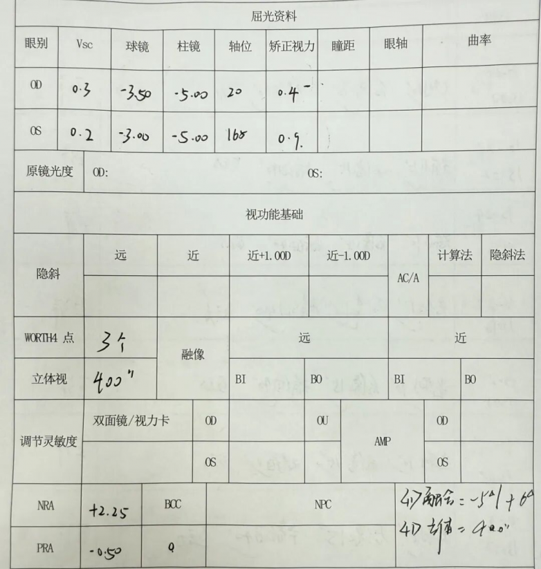 进一步检查发现,王同学右眼存在明显抑制现象——在中远距离视物时,右眼几乎“放弃工作”,完全依赖左眼。这导致他的立体视觉严重受损,仅为400角秒,远低于正常值。