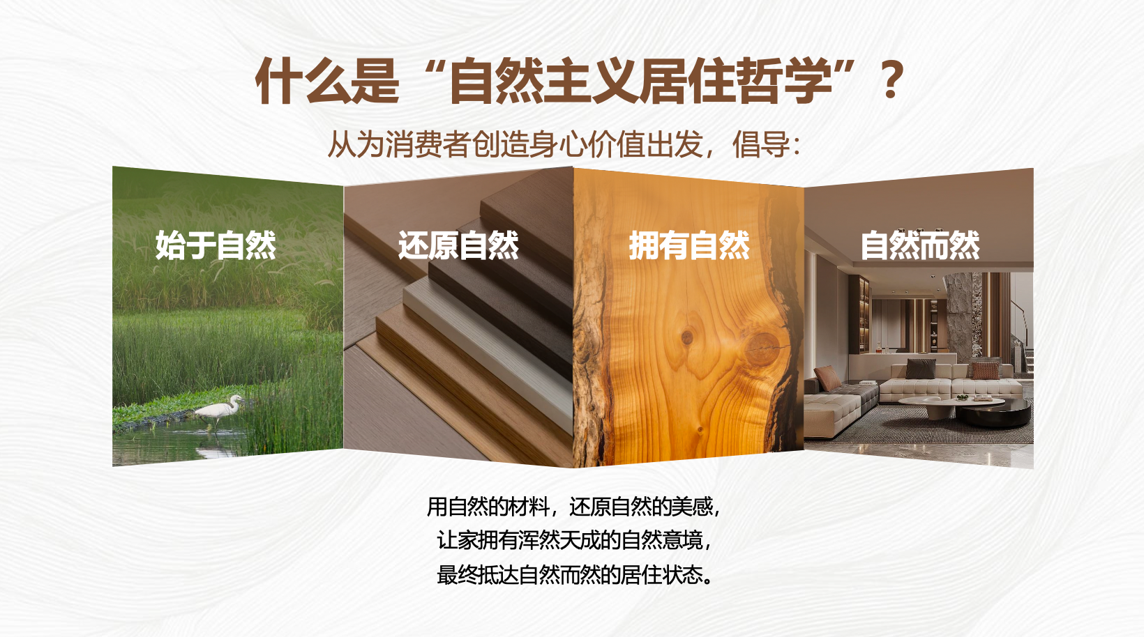 1. 首个提出【自然主义居住哲学】:倡导“始于自然、还原自然、拥有自然、自然而然”,不只是做优质板材,更关注居住者的身心健康,用自然能量治愈现代焦虑;