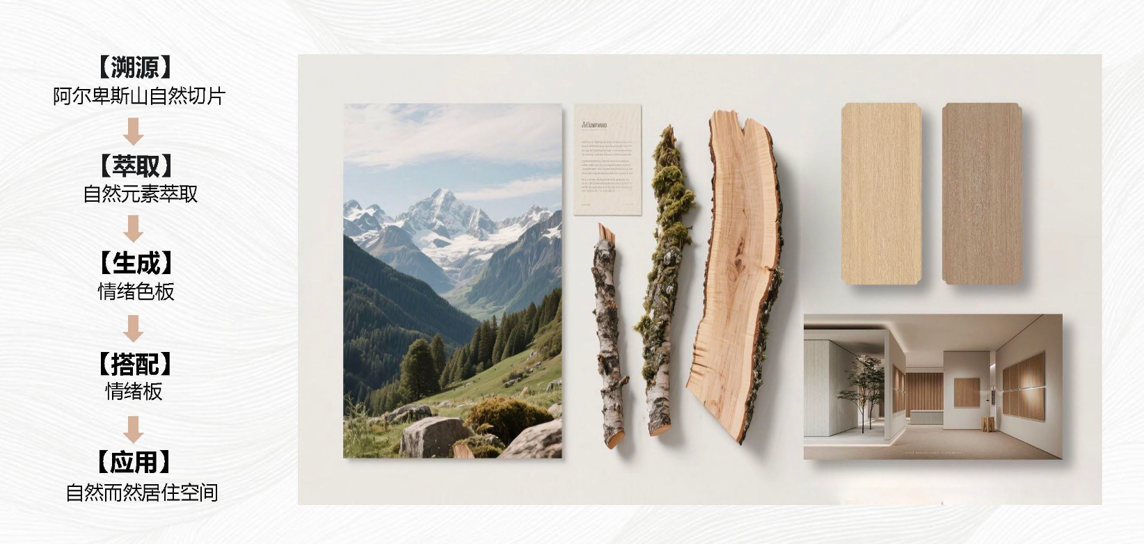 依托自然意境搭配法则,尼尔科达提供50套自然切片+100套精板情绪板+8大风格场景指南,无需专业设计师也能搭出高级感,其核心逻辑源于“自然主义搭配法则-溯源图谱”:【溯源全球稀缺自然风景】→【萃取核心自然元素】→【生成专属情绪色板】→【搭配精板组合方案】→【落地自然而然居住空间】,每一步都有据可依,告别盲目搭配。