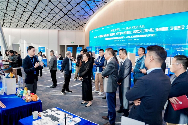 展区现场气氛热烈,50+企业展位依次排开,集中展示了从AI核心元器件、智能解决方案到创新潮玩硬件的全产业链成果。观众穿梭于各展位间,近距离体验前沿科技产品,互动交流频繁,充分彰显了科创合伙人协同共创的蓬勃活力。