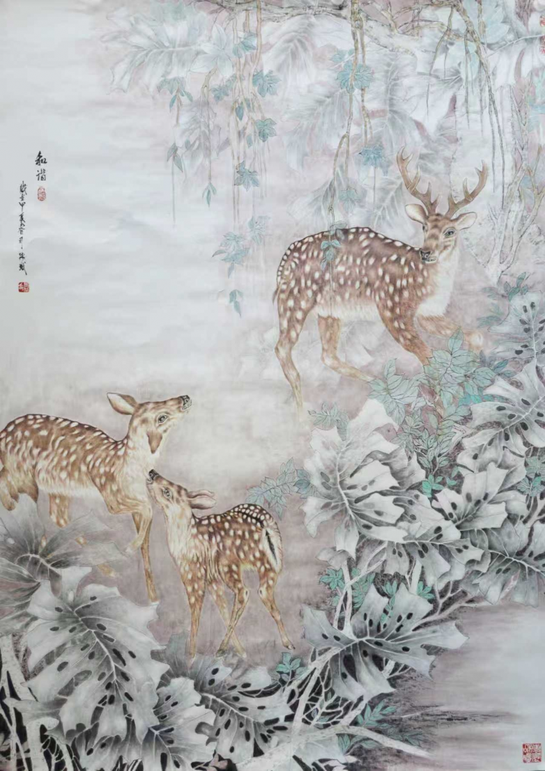 张斌的绘画缘,始于家庭熏陶下对小动物的喜爱。初遇天津画坛大师刘奎龄的动物丝毛法时,她便被这能让生灵 “活” 起来的技艺深深吸引:“刘老先生的丝毛法独树一帜,每一笔都藏着对生命的敬畏。” 为精研此技,她数十载潜心求索,从观察家犬毛发纹理到临摹古画虎鹿姿态,将 “师法自然” 与 “传承古法” 熔于一炉。其《上山虎》入选全国大展并获 “十大虎画家提名奖”,《鹿》系列更摘得全国 “金色年华” 金奖 —— 画中鹿群徜徉青山绿水,丝毛细腻如绒,眼神温润如玉,既承刘奎龄技法精妙,又注入女性对生命的柔缓感知,让 “福禄寿喜” 的传统寓意化作可触的艺术温度。