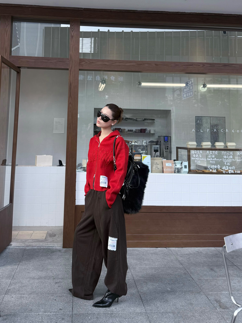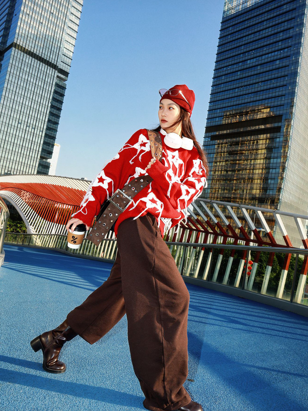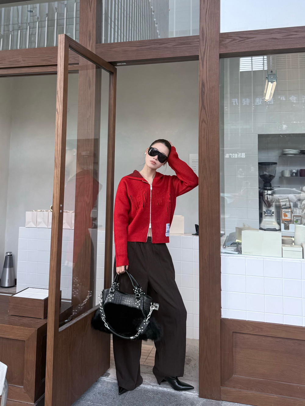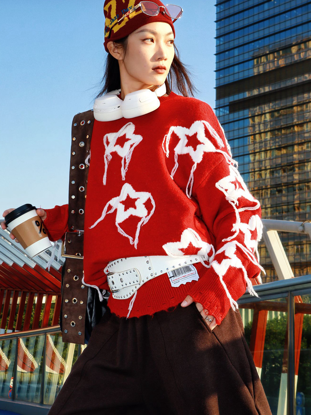 抬手间流苏随动作轻晃,自带动态张力,为静态穿搭增添灵动细节。穿搭时可搭配深棕色阔腿裤打造松弛比例,外搭铆钉装饰腰带强化街头属性,再配上同色系针织帽与复古墨镜,早春户外出片率直接拉满,红调与暖棕的碰撞也让新年氛围更具层次。