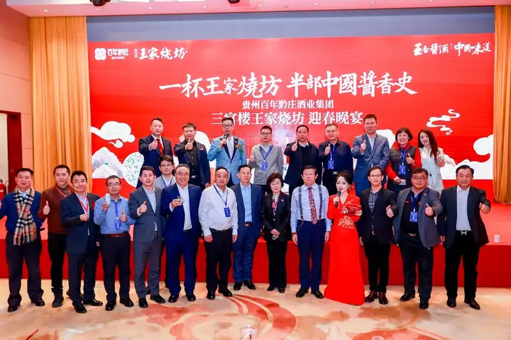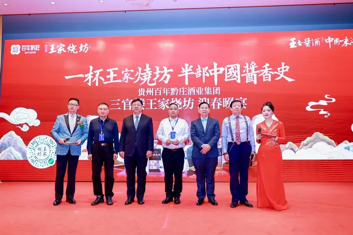【图说:贵州百年黔庄酒业集团独家冠名迎春晚宴,背景板“一杯三官楼王家烧坊 半部中国酱香史”醒目呈现,晚宴现场氛围热烈非凡。】